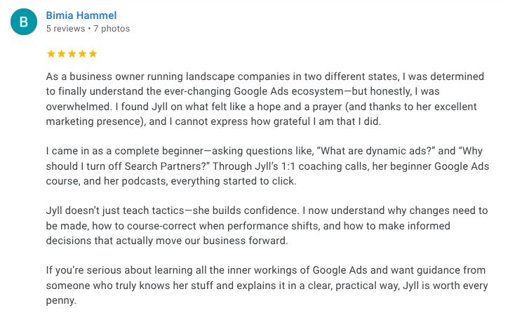 That’s exactly where Ariana was when we hopped on our monthly Google Ads coaching call to review performance, and discuss strategy and optimizations.